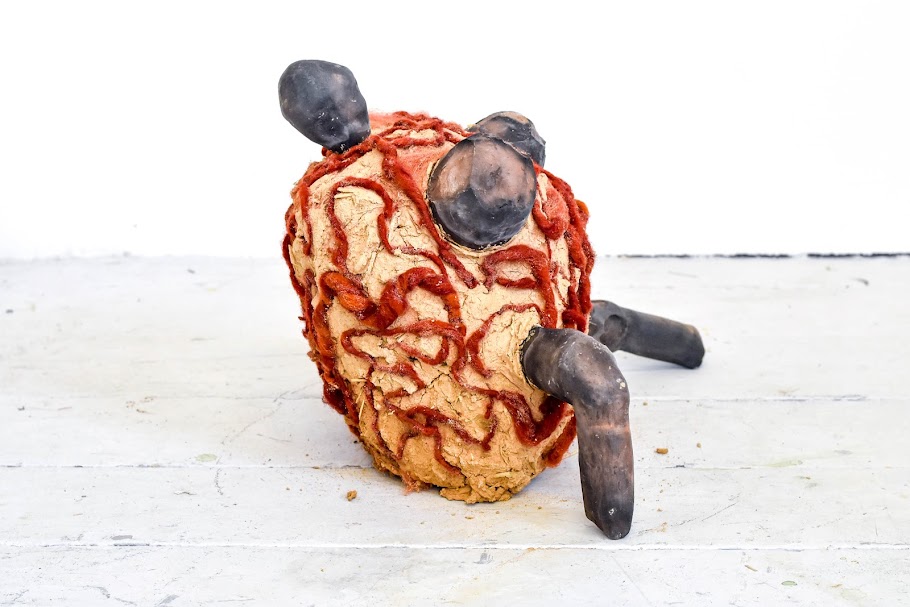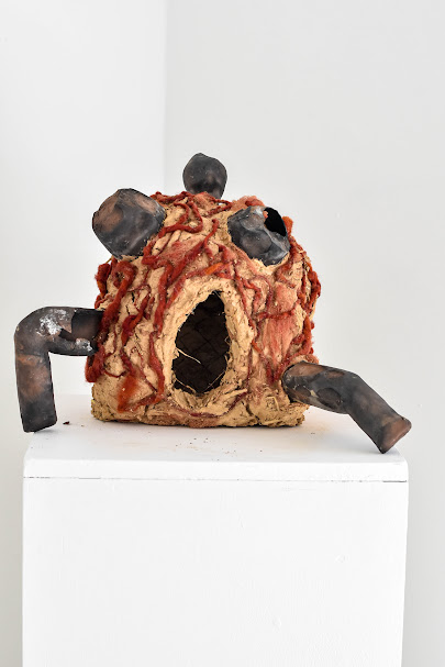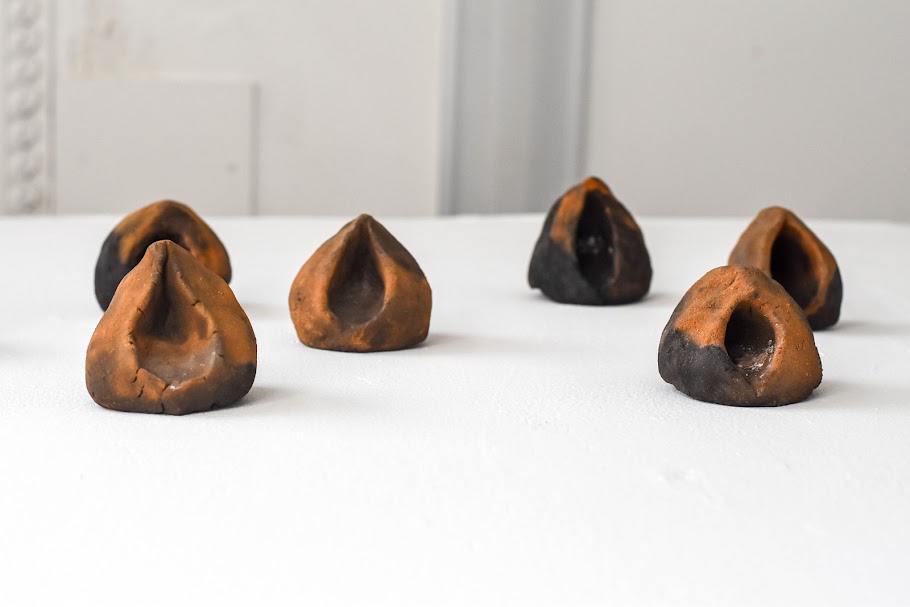 I use natural materials with ancient connections. Using local foraged clay from Cornwall, rich in its pagan spiritual history, and from sites that were clay sources in neolithic times. The process of foraging is restorative, creating a personal connection to the materials and engaging with natural surroundings. Rekindling the pilgrimages of collecting clay, rebirths the neolithic past and their way of life that honours earth’s beauty and raw materials. In addition, using traditional processes like pit firing, cobbing, natural dyeing and spinning wool, ties my work in a cycle defying categories of body, gender, history and time.