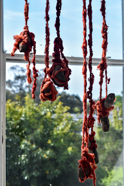Pit-fired Gabbroic clay, Gunwalloe clay and straw cob mixture, Hand-spun wool dyed with madder root