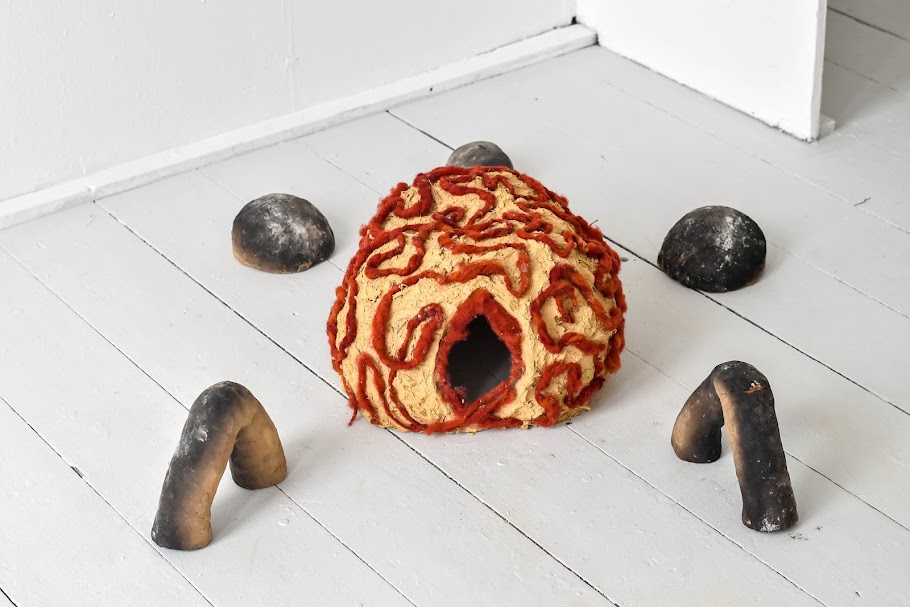 Pit fired Terracotta clay, Gunwalloe clay and straw cob mixture, Hand-spun wool dyed with madder root