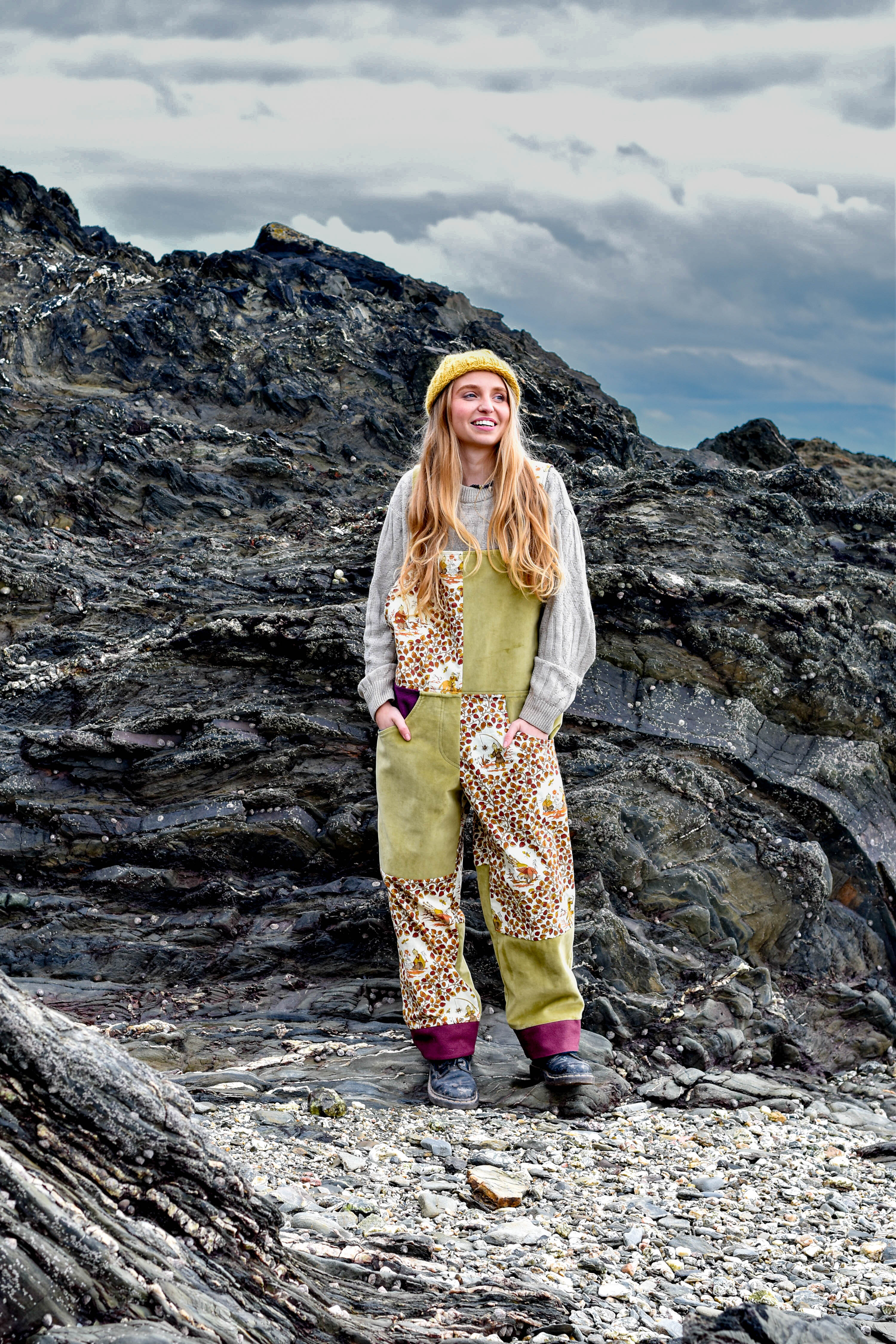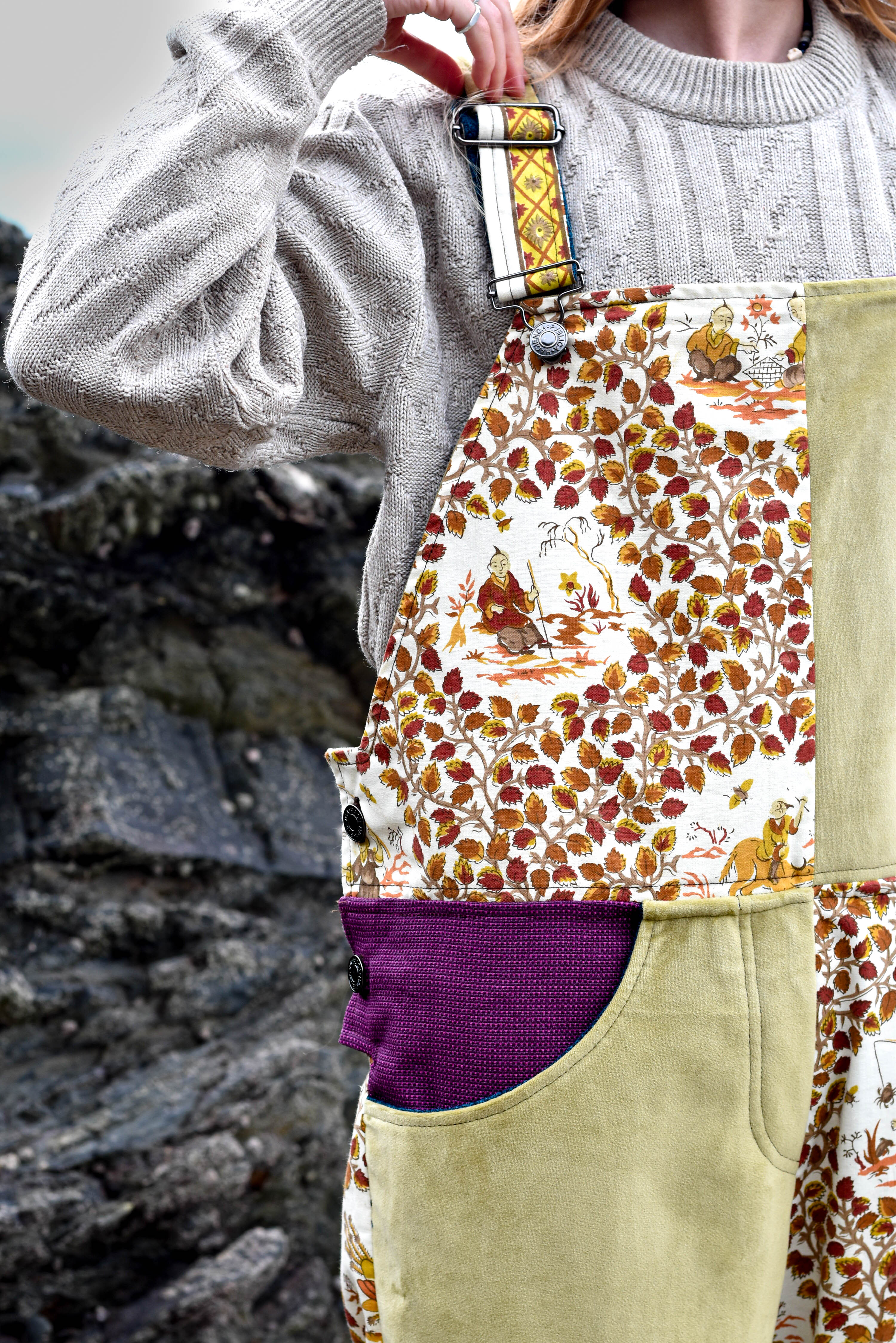 Dungarees made from old curtains and upholstery fabric so they are very durable and hardwearing and giving new life to these scrap fabrics. They are a loose comfy fit so can fit a range of sizes from 6-12 ish. Model is 5,4″ and is around a size 8. I am also open to commissions if you have any special or meaningful fabric which you would like made into a pair of dungarees that are so comfy you will live in them!
